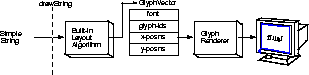 Figure 4-13 and Figure 4-14 illustrate how GlyphVector objects are used by layout mechanisms. Figure 4-13 shows the default layout mechanism. When drawString is called on a String, the built-in layout algorithm: