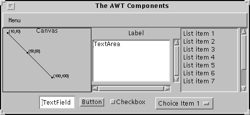 This page presented a whirlwind tour of the AWT components. Every component this page mentions is described in detail in Using Components, the GUI Building Blocks.