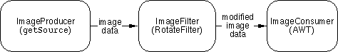 rotateImage()method instantiates the image filter by calling the filter's constructor. The single argument to the constructor is the angle, in radians, to rotate the image by.Next, theImageFilter filter = new RotateFilter(angle);rotateImage()method creates a FilteredImageSource instance. The first argument to the FilteredImageSource constructor is the image source, obtained with thegetSource()method. The second argument is the filter object.Finally, the code creates a second Image,ImageProducer producer = new FilteredImageSource( sourceImage.getSource(), filter);resultImage, by invoking the ComponentcreateImage()method. The lone argument tocreateImage()is the FilteredImageSource created in the above step.resultImage = createImage(producer);What Happens Behind the Scenes