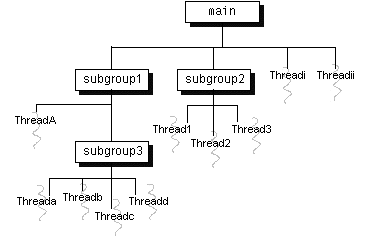 ThreadGroups can contain not only threads but also otherThreadGroups. The top-most thread group in a Java application is the thread group namedmain. You can create threads and thread groups in themaingroup. You can also create threads and thread groups in subgroups ofmain. The result is a root-like hierarchy of threads and thread groups:The ThreadGroupclass has methods that can be categorized as follows: